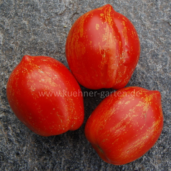 Früchte: rot mit orangefarbenen Streifen, birnenförmig/herzförmig mit ausgeprägter Spitze, wohlschmeckend, aromatisch, fest