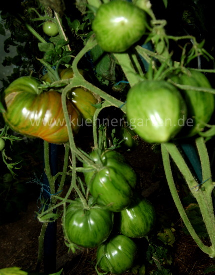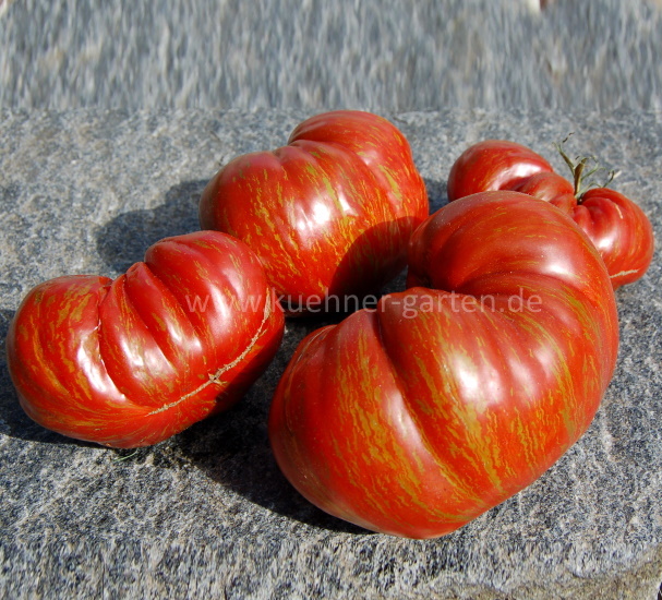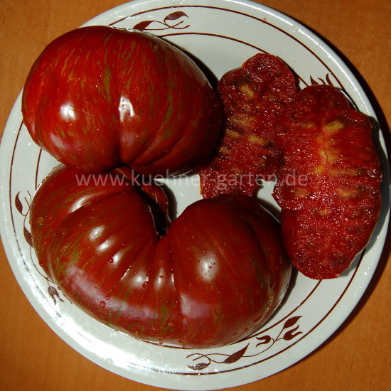 Früchte: mehrfarbig: dunkelrot-braun mit grünen Streifen; herzförmig, teilweise leicht gerippt; sehr süß, fruchtiger Geschmack und Aroma