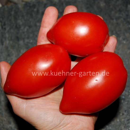 Früchte: knallrot; in Form einer prallen Pflaume, teils mit Rillen oder herzähnlich; süß, aromatisch, wohlschmeckend, fleischig