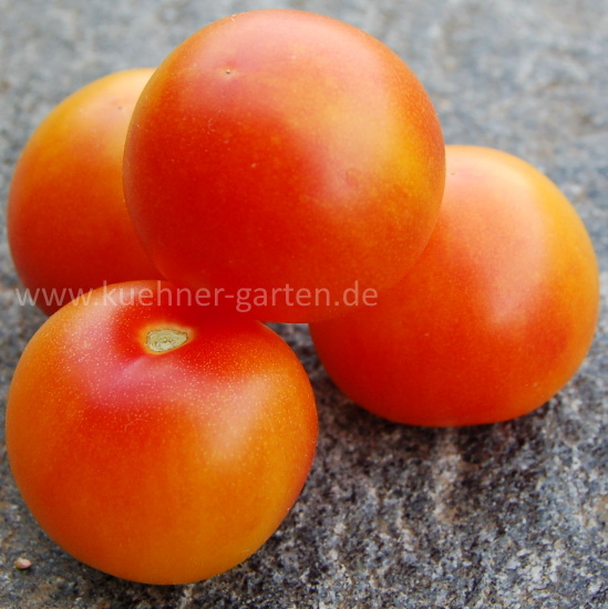 Die "Small Tangerine" ist eine bildhübsche, mehrfarbige Sorte aus den USA. Dies ist eine Cocktailtomate, deren Pflanzen zunächst völlig unscheinbar wirken – bis die Früchte zu reifen beginnen. Je weiter sie ausreifen, desto intensiver wird ihre Färbung: zuerst erscheinen sie gelb, dann entwickeln sie eine marmorierte Zeichnung mit Nuancen von Gelb, Orange und Rosa.