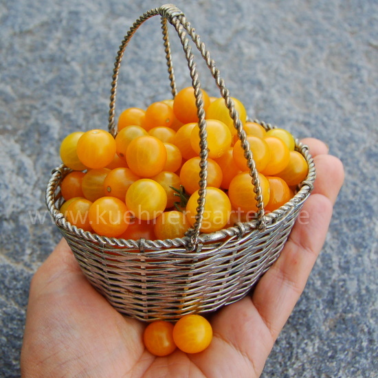 Wie die berühmte Tomate "Petit Moineau" ( Sweet Red Currant ) gehört auch die Sorte "Gelbe Johannisbeere" zur wildwachsenden Art Solanum pimpinellifolium. Sie zeichnet sich durch eine sehr hohe Ertragskraft aus und bildet zahlreiche lange Rispen mit saftigen gelben Früchten.