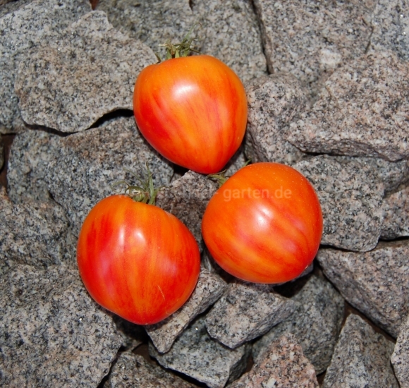 Früchte: mehrfarbig: rot-orange-rosa; herzförmig, sehr süß, aromatisch, lecker, fruchtiger Geschmack
