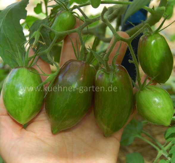 Je nach Sonnenintensität färbt sich die der Sonne zugewandte Tomatenseite lila und die der Sonne abgewandte Tomatenseite orange-rot.