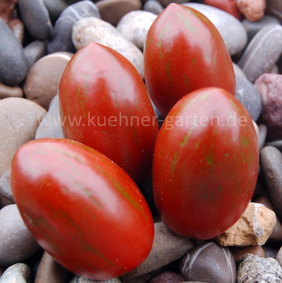 Früchte: schokoladenfarbig mit grünen Streifen, oval mit einer Spitze, süß, fest, lange lagerfähig