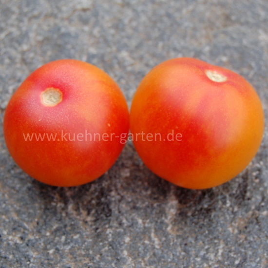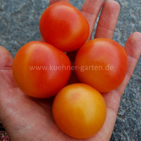 Die "Small Tangerine" ist eine bildhübsche, mehrfarbige Sorte aus den USA. Dies ist eine Cocktailtomate, deren Pflanzen zunächst völlig unscheinbar wirken – bis die Früchte zu reifen beginnen. Je weiter sie ausreifen, desto intensiver wird ihre Färbung: zuerst erscheinen sie gelb, dann entwickeln sie eine marmorierte Zeichnung mit Nuancen von Gelb, Orange und Rosa.